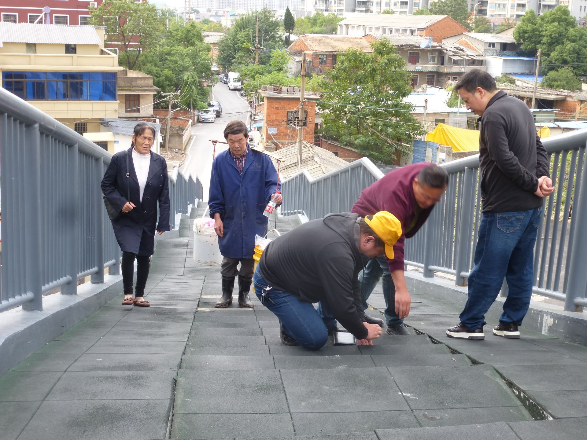 10月22日下午,经市护路办协调,武汉铁路局武汉桥工段及施工单位相关负责人前往安平路人行天桥现场勘察,共商维修方案。据介绍,该天桥铺设的塑胶地垫因长期受雨水浸泡和阳光暴晒,胶水黏性减弱,导致地垫出现破损、脱落现象。仅局部更换塑胶地垫,无法保证其使用年限。为此,武汉铁路局武汉桥工段相关负责人表示,将尽快联系专业技术团队,制定科学、实用的修复方案。