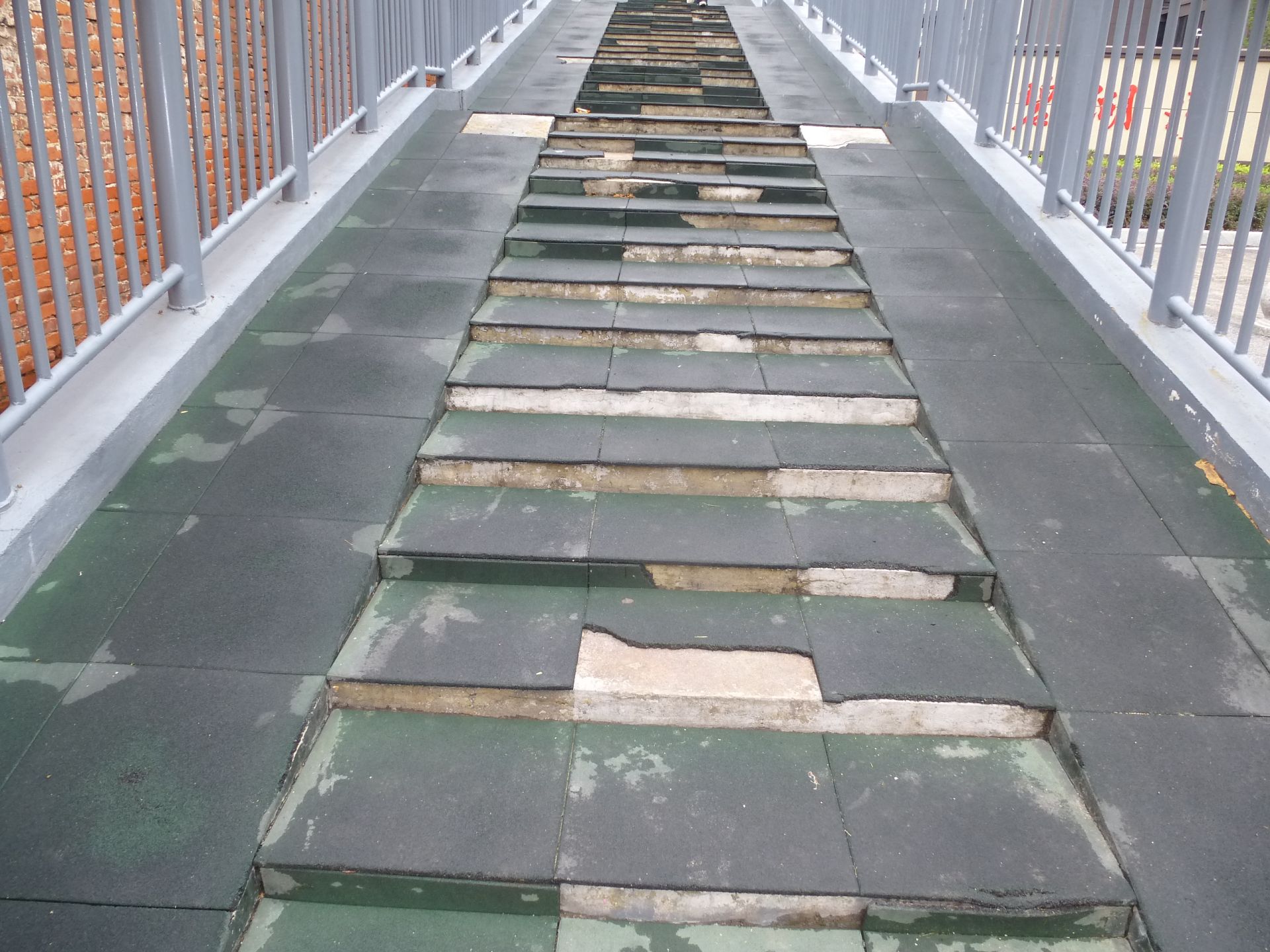 “每天都要经过这座天桥,上下台阶时都得小心翼翼,生怕摔跤。”市民柯菁指着破损的台阶说,“前两天下雨,破损的地方湿滑难行,大家上下台阶时不得不放慢脚步。这些塑胶地垫本应起到防滑作用,如今因为破损却成了‘陷阱’。”
