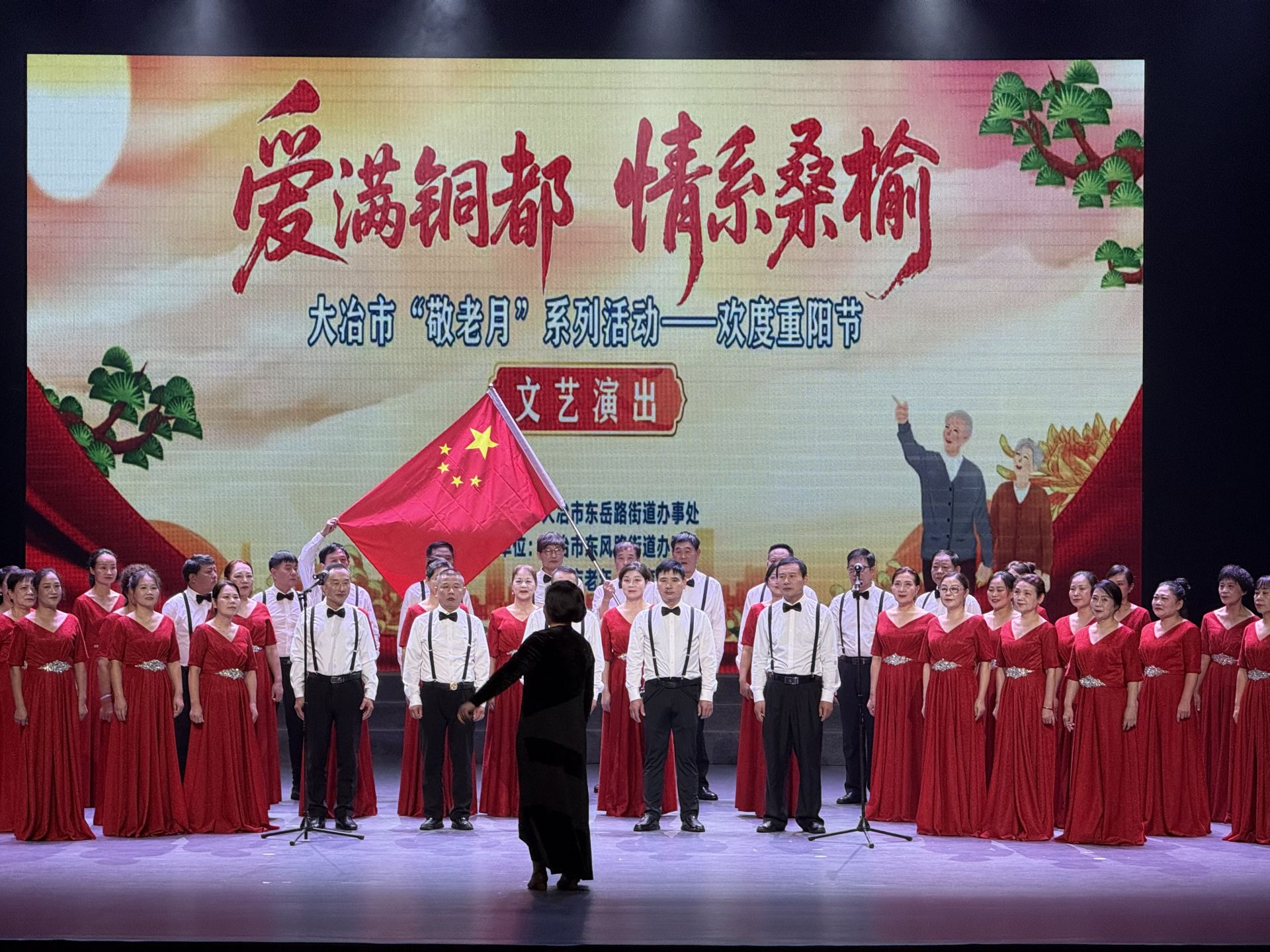 云上大冶报道(记者 柏蔷薇)金秋送爽,情暖桑榆。10月26日,由市老体协主办的“爱满铜都,情系桑榆”重阳节文艺汇演在北门剧院隆重上演。