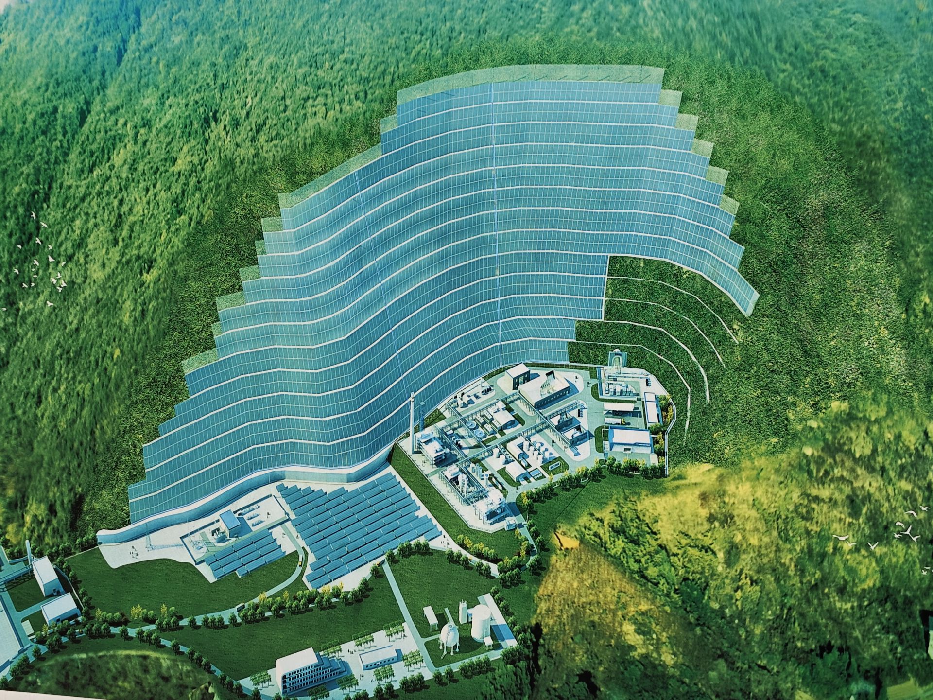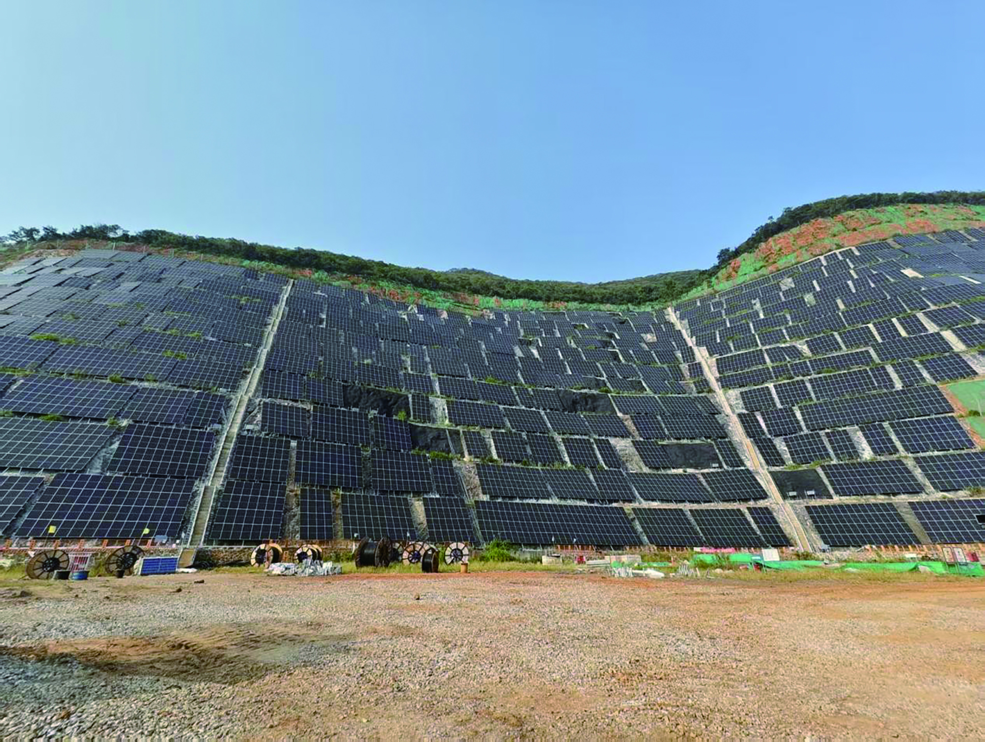绿氢的“绿”,根源在“电”。制氢工厂旁的尾矿山上,宋晚村地面光伏电站EPC项目的黑色面板正高效捕捉每一缕阳光。这片由废弃矿山改造的光伏场,总装机20兆瓦,预计年发电2000万度,可直供制氢车间。