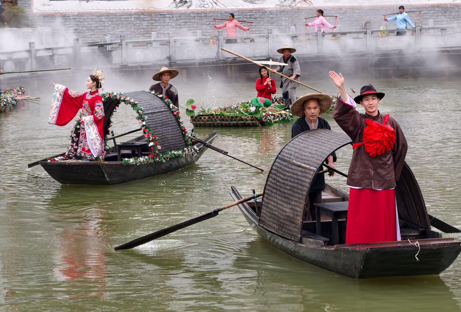 这场演出集合了撒网捕鱼、水上市集、村舍夜话、欢庆丰收等16个极具乡土气息的场景,游客乘船漫游其中,仿佛穿越千年,亲身感受世外桃源的独特魅力与原生态的农耕生活、风土人情。