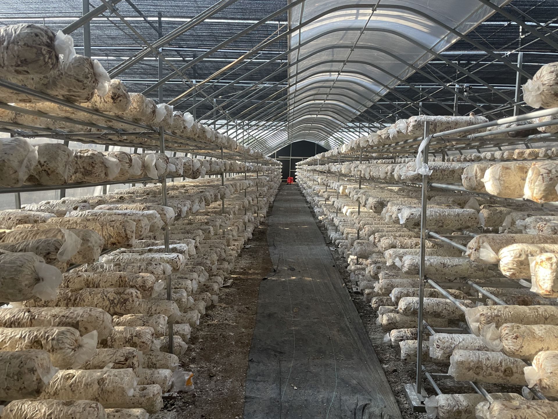 与稍显冷清的民宿相比,不远处的食用菌产业园却是一派忙而不乱的景象。20亩大棚内温湿可控,一排排菌棒整齐列阵,表面已由纯白悄然转为浅褐——这是香菇出菇前的关键“转色期”。工作人员轻手轻脚巡检,生怕惊扰了这些正在“酝酿香气”的小生命。