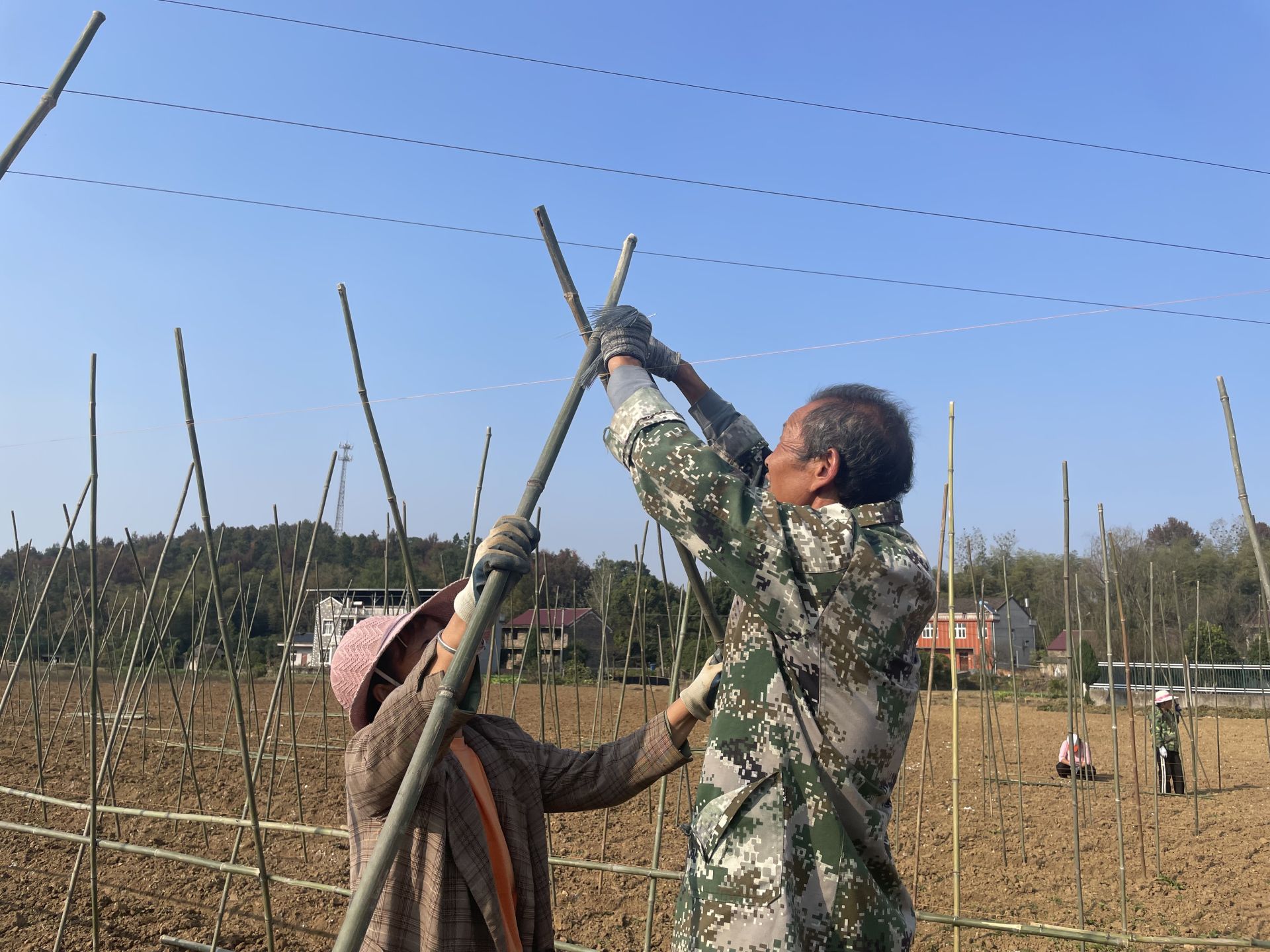 在园区另一侧,村民们正忙着搭建新棚。立毛竹、绑拱杆、拧铁丝,传统施工方式既环保又高效。村民陈春芳刚干完菌棚里的活,又来帮忙扶竹架。“现在既能收租金,又能在家门口务工,一个月能挣2000多元。”她擦着汗,脸上洋溢着满足的笑容。