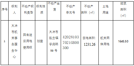 大冶市机关事务服务中心(陈贵综合执法中心)位于大冶市陈贵镇学府路59号宗地,因办理不动产登记需要进行不动产权籍调查,根据《国土资源部关于做好不动产权籍调查工作的通知》(国土资发【2015】41号)、《地籍调查规程》(GB/T 42547-2023)、《自然资源部关于加快解决不动产登记若干历史遗留问题的通知》(自然资发[2021]1号文)、鄂自然资函【2020】390号文,现将该宗地不动产权籍调查结果予以公示,若相关邻宗地土地权属人对该宗地的公示情况有异议的,请自本公告之日起十五个工作日内将异议书面材料送达我中心。逾期无人提出异议或异议不成立的,我中心将按不动产权籍公告结果予以登记。