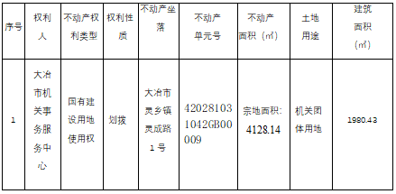 大冶市机关事务服务中心(灵成工业园区服务中心)位于大冶市灵乡镇灵成路1号宗地,因办理不动产登记需要进行不动产权籍调查,根据《国土资源部关于做好不动产权籍调查工作的通知》(国土资发【2015】41号)、《地籍调查规程》(GB/T 42547-2023)、《自然资源部关于加快解决不动产登记若干历史遗留问题的通知》(自然资发[2021]1号文)、鄂自然资函【2020】390号文,现将该宗地不动产权籍调查结果予以公示,若相关邻宗地土地权属人对该宗地的公示情况有异议的,请自本公告之日起十五个工作日内将异议书面材料送达我中心。逾期无人提出异议或异议不成立的,我中心将按不动产权籍公告结果予以登记。