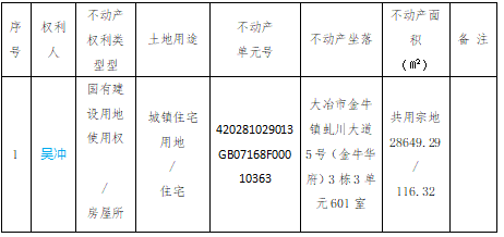 吴冲对坐落于大冶市金牛镇虬川大道5号(金牛华府)3栋3单元601室,申请转移登记(继承),现根据《不动产登记暂行条例》、《不动产登记暂行条例实施细则》、《不动产登记操作规范(试行)》之规定,对该申请予以审查并予公告。如对上述内容有异议,请自本公告之日起十五个工作日内将异议书面材料送达大冶市不动产登记中心。逾期无人提出异议或者异议不成立的,我机构将予以登记并颁发不动产权证书。