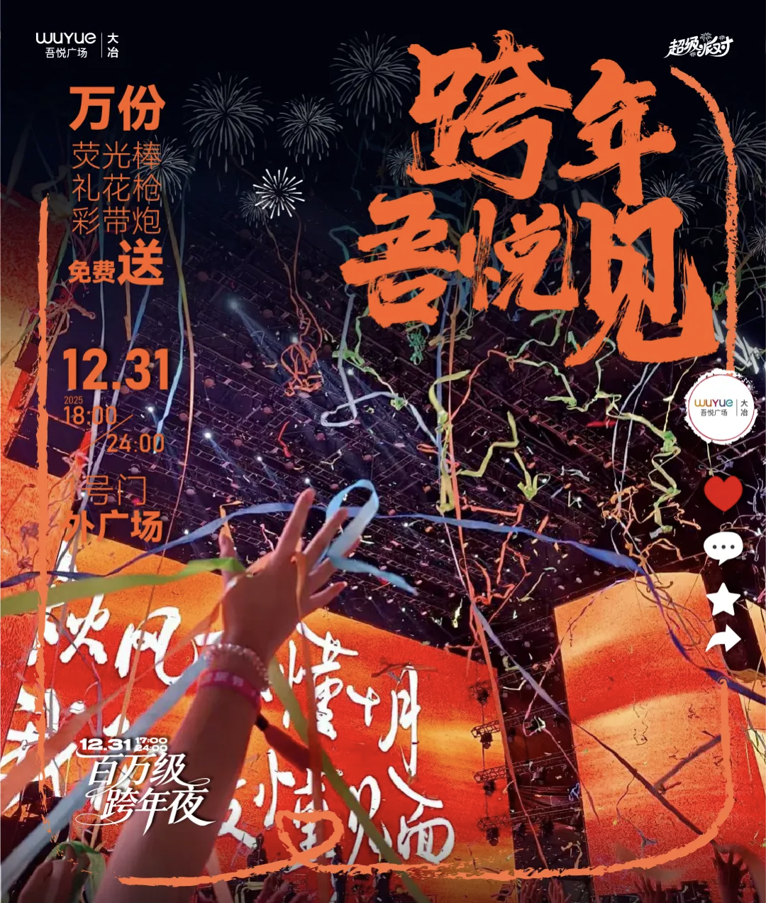 吾悦广场聚焦年轻潮流,于12月31日17:30至次日0:30开启“跨年狂欢夜”。现场将呈现万人倒计时、浏阳烟花秀、K-POP随舞派对及女团热舞等视听盛宴,穿插人工飘雪营造梦幻场景。7小时Live音乐会覆盖千禧金曲至摇滚狂欢,终极大奖“年度锦鲤”享全年免费停车、奶茶及观影特权。