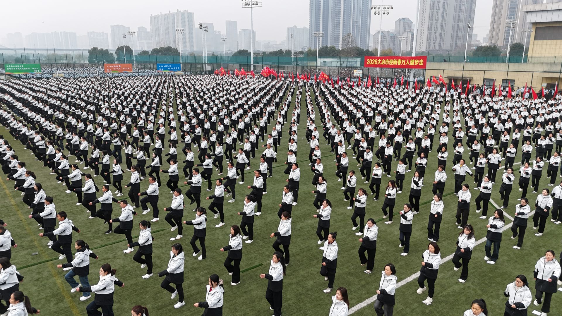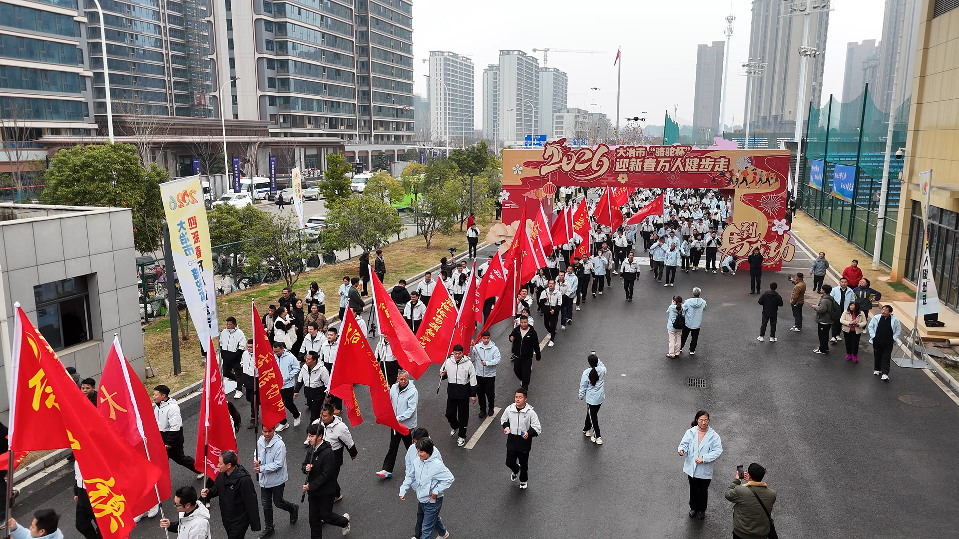 云上大冶报道(记者 石程曦 但超 方诗琪)万人健步迎新春,同心建功“十五五”。12月31日,由市委、市政府主办,市总工会、市体育事业发展中心、市农发集团承办的2026年大冶市“骆驼杯”迎新春万人健步走活动在大冶市足球公园拉开帷幕。来自全市各部门、企事业单位的万名干部职工精神饱满、步伐整齐,以昂扬的姿态共同迎接2026年的到来。