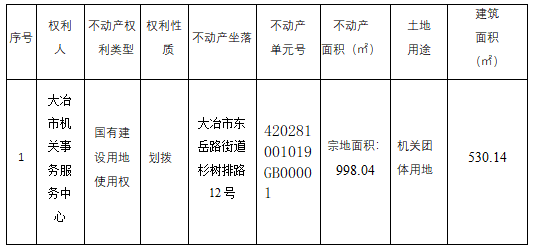 大冶市机关事务服务中心(环境卫生管理局)位于大冶市东岳路街道杉树排路12号宗地,因办理不动产登记需要进行不动产权籍调查,根据《国土资源部关于做好不动产权籍调查工作的通知》(国土资发【2015】41号)、《地籍调查规程》(GB/T 42547-2023)、《自然资源部关于加快解决不动产登记若干历史遗留问题的通知》(自然资发[2021]1号文)、鄂自然资函【2020】390号文,现将该宗地不动产权籍调查结果予以公示,若相关邻宗地土地权属人对该宗地的公示情况有异议的,请自本公告之日起十五个工作日内将异议书面材料送达我中心。逾期无人提出异议或异议不成立的,我中心将按不动产权籍公告结果予以登记。