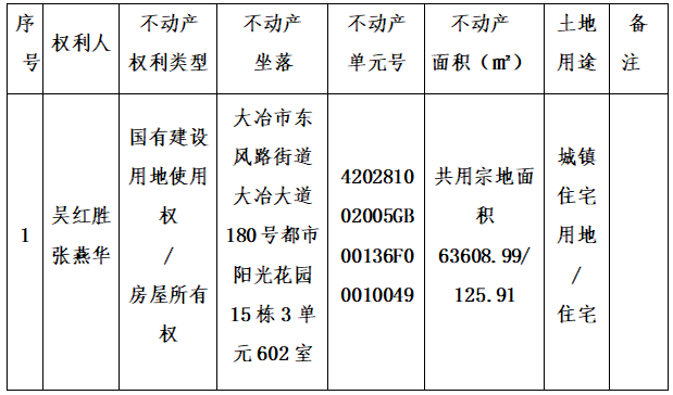 吴红胜、张燕华对坐落于大冶市东风路街道大冶大道180号都市阳光花园15栋3单元602室不动产申请登记,因转让方武汉仁信房地产开发有限公司无法在不动产登记申请书中申请人(义务人)栏签章,现根据《不动产登记暂行条例》、《不动产登记暂行条例实施细则》、《不动产登记操作规范(试行)》之规定,我中心对该申请予以审查并予公告。如对所述内容有异议,请自本公告之日起十五个工作日内将异议书面材料送达大冶市不动产登记中心综合窗口。逾期无人提出异议或者异议不成立的,我机构将予以登记并颁发不动产权证书。