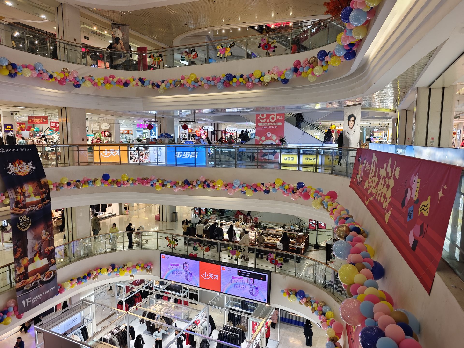 当天,两大商场张灯结彩,各专柜备足冬装、年货,吾悦餐饮区人潮涌动,火锅、烤肉店等位超百桌,服务员穿梭传菜,餐饮区增配人员应对客流高峰。吾悦广场外场巨型LED屏滚动“万人倒计时”,雨润中央商场中庭圣诞树缀满灯饰,游戏厅推出“跨年限时折扣”,年轻人组队闯关笑声不断。非遗展演的龙狮道具、绣娘丝线已在后台就位,处处洋溢节日氛围。