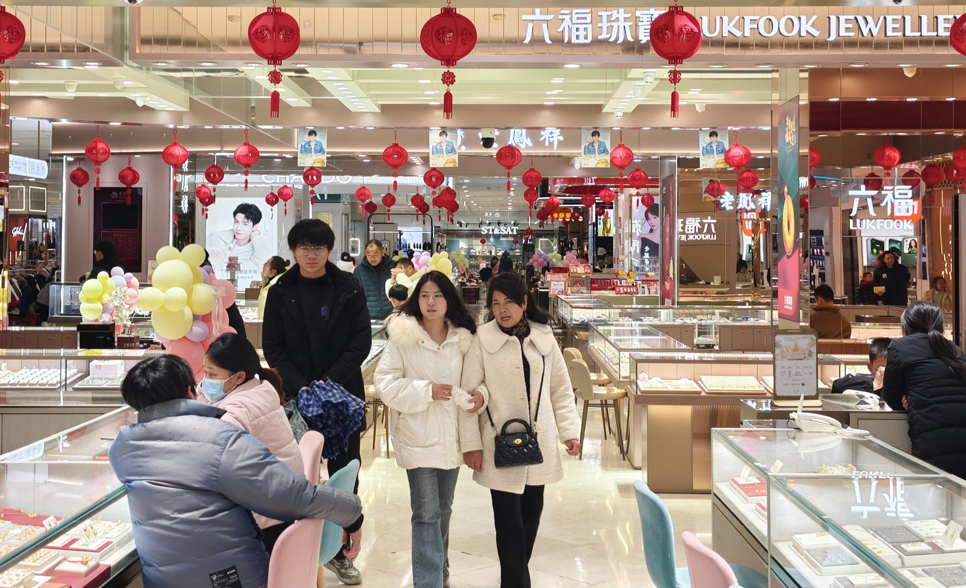 “很多家庭听到我们之前发的黄金折扣活动,都在今晚过来了。”雨润中央商场某黄金品牌导购员小杨忙得脚不沾地,她表示活动这几天黄金销售额同比翻番,好多人专门在今天过来买婚庆首饰。