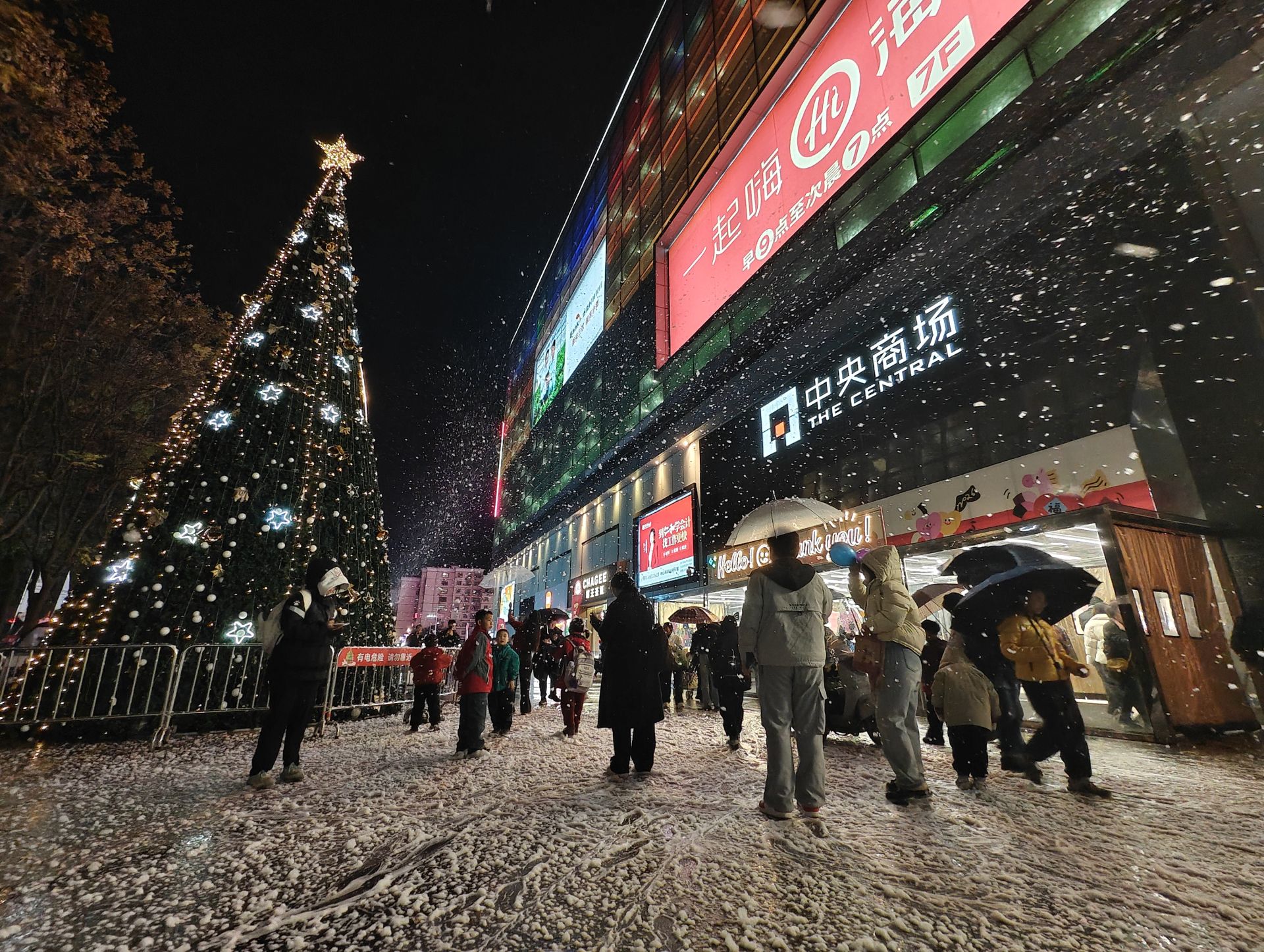 沉浸式场景打造成为新亮点。吾悦广场外场“百万烟花+万人倒计时”在零时启动,7小时LIVE音乐会串联70后怀旧金曲、90后青春专场、00后摇滚串烧;雨润中央商场则用“飘雪许愿”营造浪漫——19时整大圣诞树旁飘雪装置启动,23时市民集聚在现场写下新年愿望,零时冷烟火与气球集体升空,夜空瞬间被彩色光影填满。