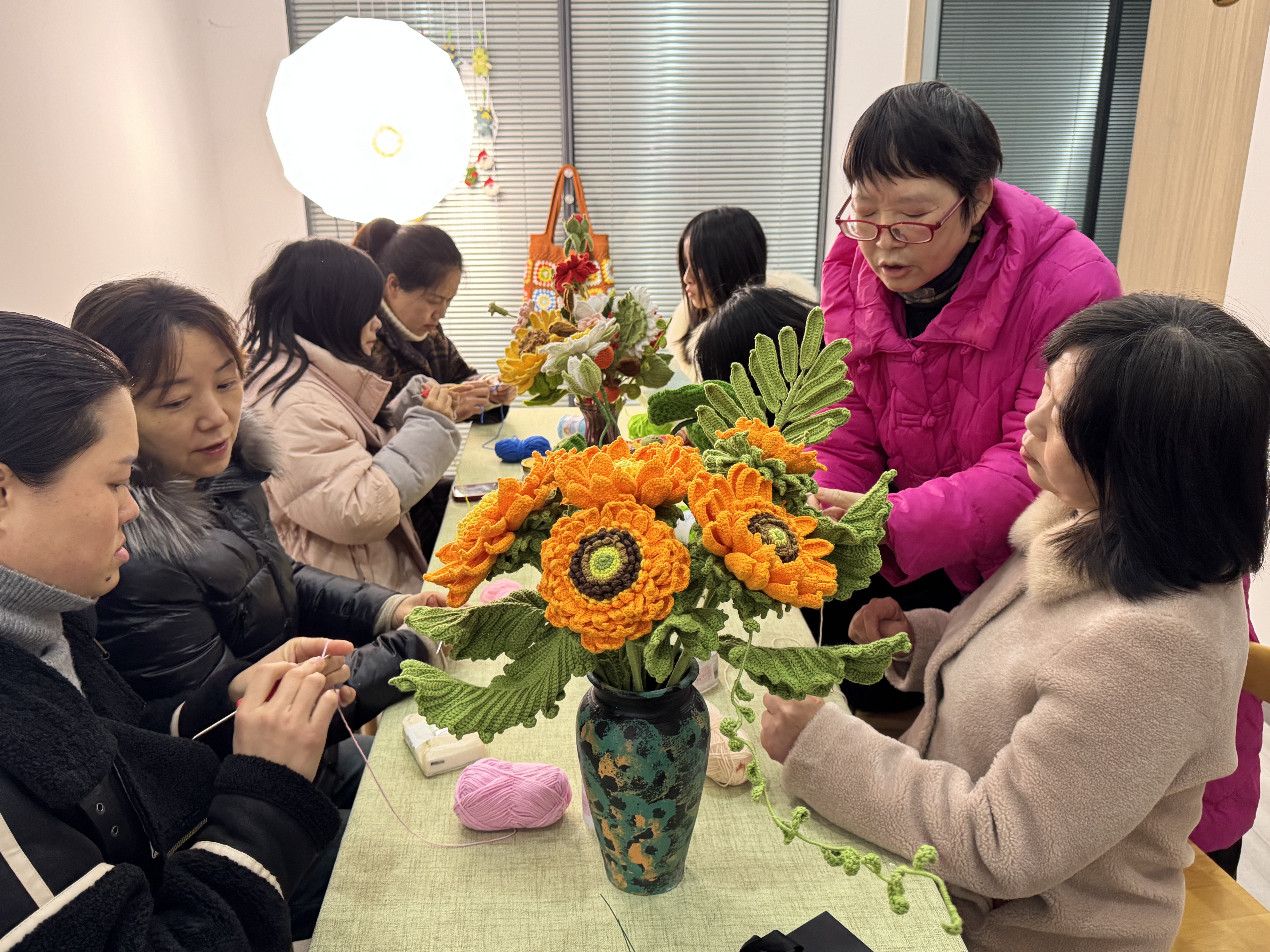 云上大冶报道(记者 张蕾)1月6日上午,户外寒意渐浓,而风华路社区活动室内却暖意融融。几位居民围坐在一起,手中钩针穿梭,彩线飞舞,一朵朵精致的“雪柳”渐渐在指尖绽放。58岁的叶琳站在中间,耐心讲解着锁针、引拔针、短针和长针的技法,时不时俯身指导。这里是“邻里手作非遗传承队”的日常教学现场,也是大冶市“爱满铜都”公益创投项目落地社区的生动缩影。