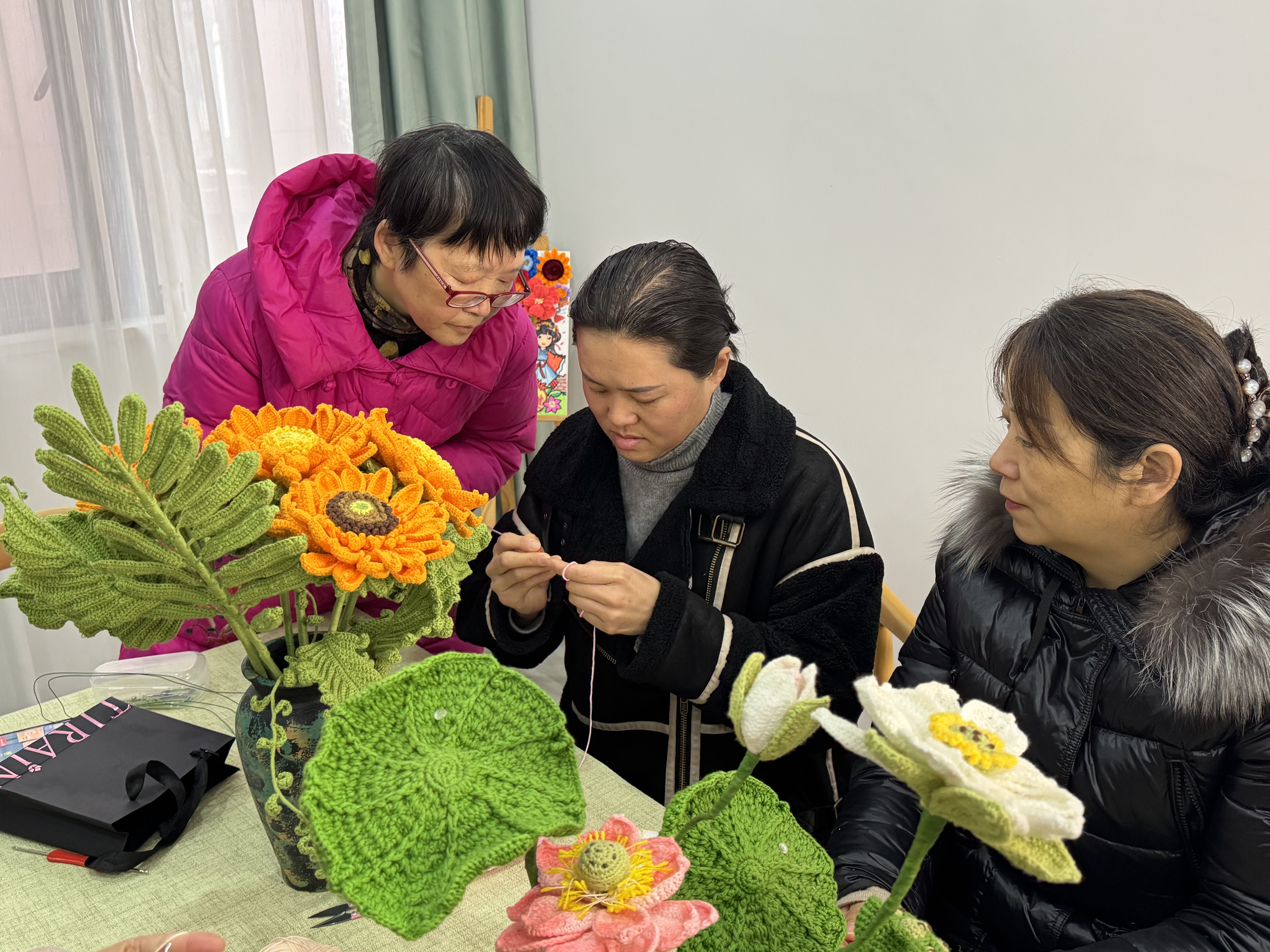 “今天学习钩针,我感觉还是上手挺快的。”学员石仪一边钩织一边笑着说,“我打算之后钩一些小玩具、小帽子给我的孩子。而且大家在一起学习我觉得还是很欢乐的,感觉非常有意思。”