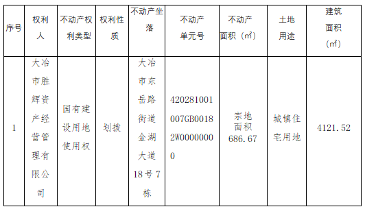 大冶市胜辉资产经营管理有限公司位于大冶市东岳路街道金湖大道18号7栋,因办理不动产登记需要进行不动产地籍调查,根据《国土资源部关于做好不动产权籍调查工作的通知》(国土资发【2015】41号)、《地籍调查规程》(GB/T 42547-2023)、《自然资源部关于加快解决不动产登记若干历史遗留问题的通知》(自然资发[2021]1号文)、鄂自然资函【2020】390号文,及相关法律法规,现将该宗地不动产地籍调查结果予以公示,若相关邻宗地土地权属人对该宗地的公示情况有异议的,请自本公告之日起十五个工作日内将异议书面材料送达我中心。逾期无人提出异议或异议不成立的,我中心将按不动产地籍公告结果予以登记。