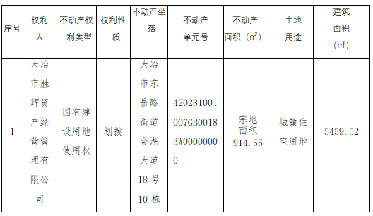 大冶市胜辉资产经营管理有限公司位于大冶市东岳路街道金湖大道18号10栋,因办理不动产登记需要进行不动产地籍调查,根据《国土资源部关于做好不动产权籍调查工作的通知》(国土资发【2015】41号)、《地籍调查规程》(GB/T 42547-2023)、《自然资源部关于加快解决不动产登记若干历史遗留问题的通知》(自然资发[2021]1号文)、鄂自然资函【2020】390号文,及相关法律法规,现将该宗地不动产地籍调查结果予以公示,若相关邻宗地土地权属人对该宗地的公示情况有异议的,请自本公告之日起十五个工作日内将异议书面材料送达我中心。逾期无人提出异议或异议不成立的,我中心将按不动产地籍公告结果予以登记。