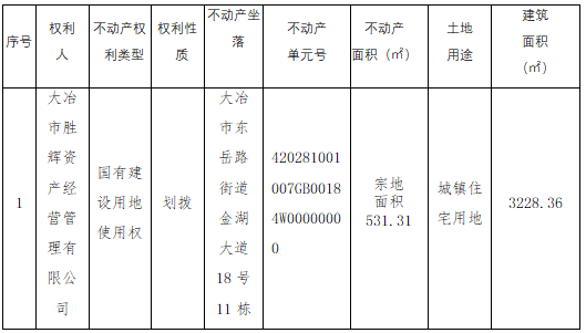 大冶市胜辉资产经营管理有限公司位于大冶市东岳路街道金湖大道18号11栋,因办理不动产登记需要进行不动产地籍调查,根据《国土资源部关于做好不动产权籍调查工作的通知》(国土资发【2015】41号)、《地籍调查规程》(GB/T 42547-2023)、《自然资源部关于加快解决不动产登记若干历史遗留问题的通知》(自然资发[2021]1号文)、鄂自然资函【2020】390号文,及相关法律法规,现将该宗地不动产地籍调查结果予以公示,若相关邻宗地土地权属人对该宗地的公示情况有异议的,请自本公告之日起十五个工作日内将异议书面材料送达我中心。逾期无人提出异议或异议不成立的,我中心将按不动产地籍公告结果予以登记。