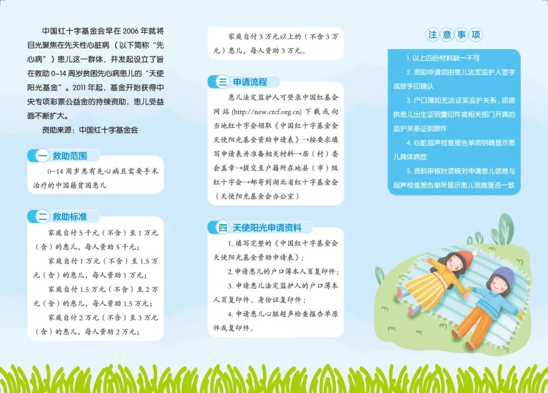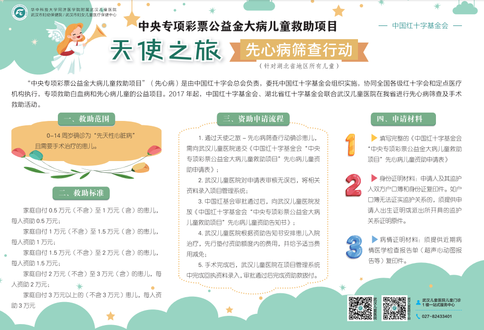 天使之旅-湖北先心病患儿筛查救助行动:室间隔缺损、房间隔缺损、动脉导管未闭、复杂先心病等先心病最高救助3万元;