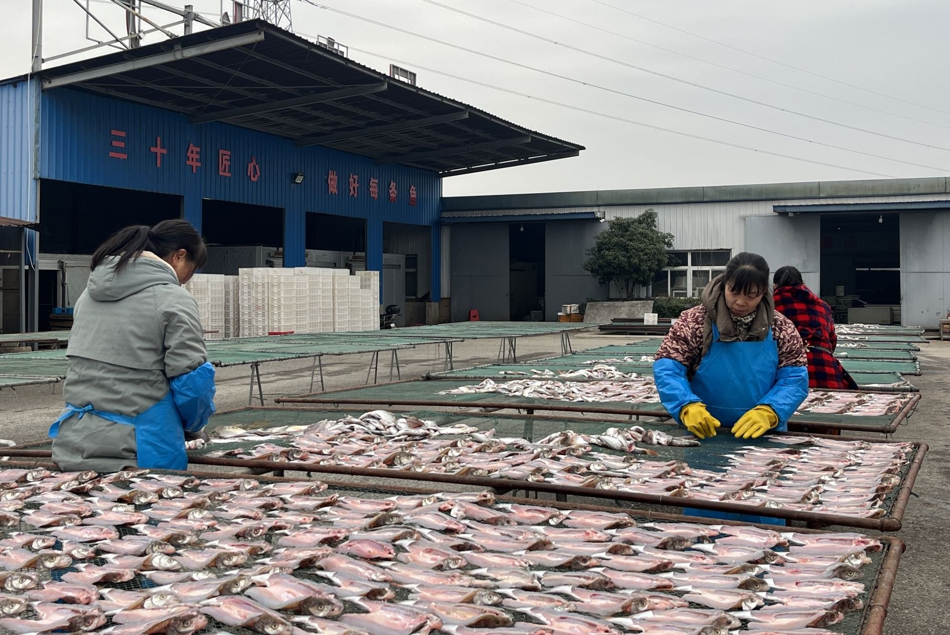 这家企业不仅把鱼做成了产业,也为附近村民带来了在家门口就业的机会。公司有一百多名工人,大多来自周边村镇。河泾港社区的吉炎一边整理鱼块一边说:“在这儿腌鱼、晒鱼、搬搬货,一个月能挣四五千元。不用上夜班,离家近,家里的事也顾得上,挺知足的。”
