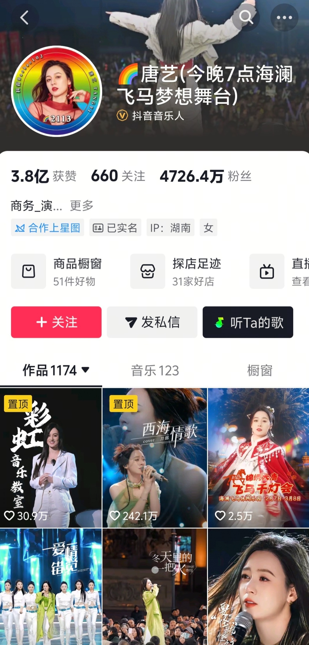 据悉,唐艺本名曹世晶,1983年生于湖南益阳,广西艺术学院舞蹈教育专业毕业,内地女歌手、抖音头部音乐主播,粉丝超4500万,素有“户外演唱天花板”之称,兼任湖南多地文旅推广大使。早年征战多项选秀赛事,2019年转型户外直播,2020年凭《浪子闲话》爆红,创立“唐艺大舞台”扶持草根歌手,登上央视及多个主流音乐舞台,代表作有《飞蛾扑火》《杯酒二两茶》等,深耕户外音乐同时助力地方文旅发展。