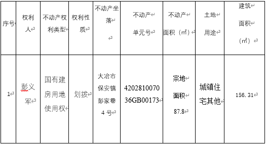 彭义军 位于大冶市保安镇彭家巷4号土地,因办理不动产登记需要进行不动产地籍调查,根据《国土资源部关于做好不动产权籍调查工作的通知》(国土资发【2015】41号)、《地籍调查规程》(GB/T 42547-2023)、《自然资源部关于加快解决不动产登记若干历史遗留问题的通知》(自然资发[2021]1号文)、鄂自然资函【2020】390号文,及相关法律法规,现将该宗地不动产权籍调查结果予以公示,若相关邻宗地土地权属人对该宗地的公示情况有异议的,请自本公告之日起十五个工作日内将异议书面材料送达我中心。逾期无人提出异议或异议不成立的,我中心将按不动产权籍公告结果予以登记。