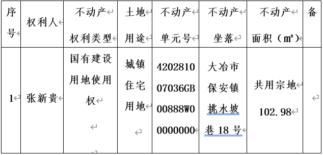 张新贵对坐落于大冶市保安镇挑水坡巷18号,申请转移登记(继承),现根据《不动产登记暂行条例》、《不动产登记暂行条例实施细则》、《不动产登记操作规范(试行)》之规定,对该申请予以审查并予公告。如对上述内容有异议,请自本公告之日起十五个工作日内将异议书面材料送达大冶市不动产登记中心。逾期无人提出异议或者异议不成立的,我机构将予以登记并颁发不动产权证书。