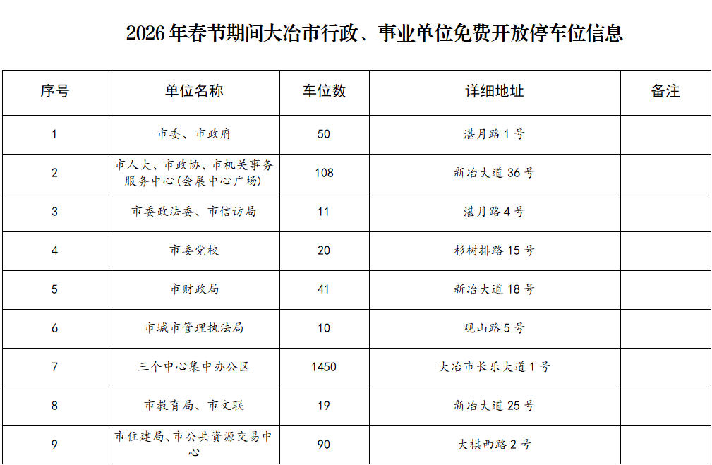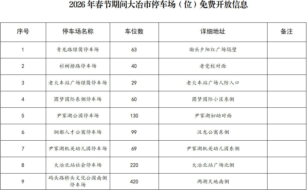 记者了解到,本次免费停车时段为2月15日20:00至2月24日8:00,精准匹配市民出行高峰。具体免费停车位、开放停车场信息,可查阅“大冶市行政、事业单位免费开放停车位信息”“大冶市停车场(位)免费开放信息”,就近停放,轻松解锁春节无忧出行。