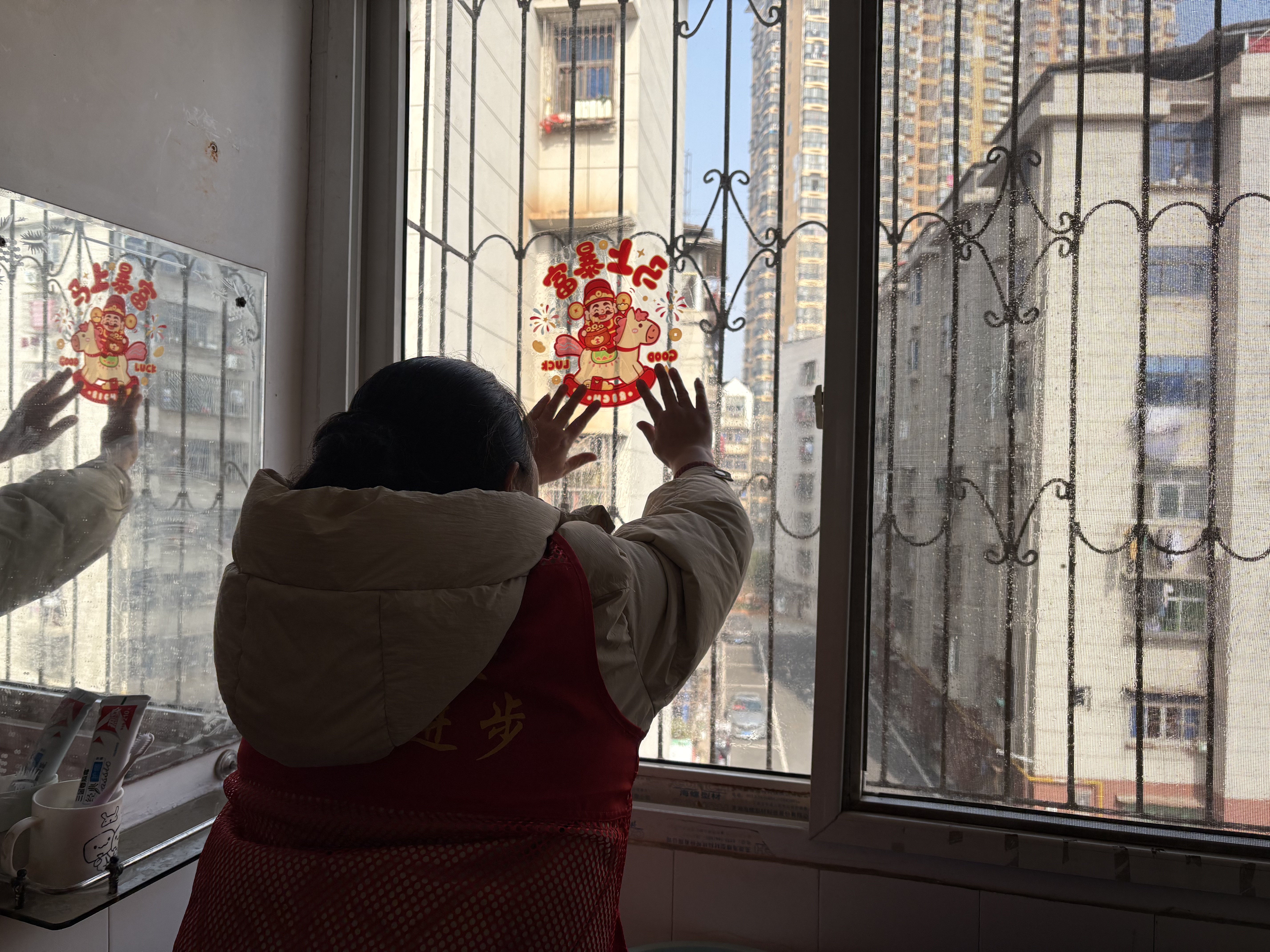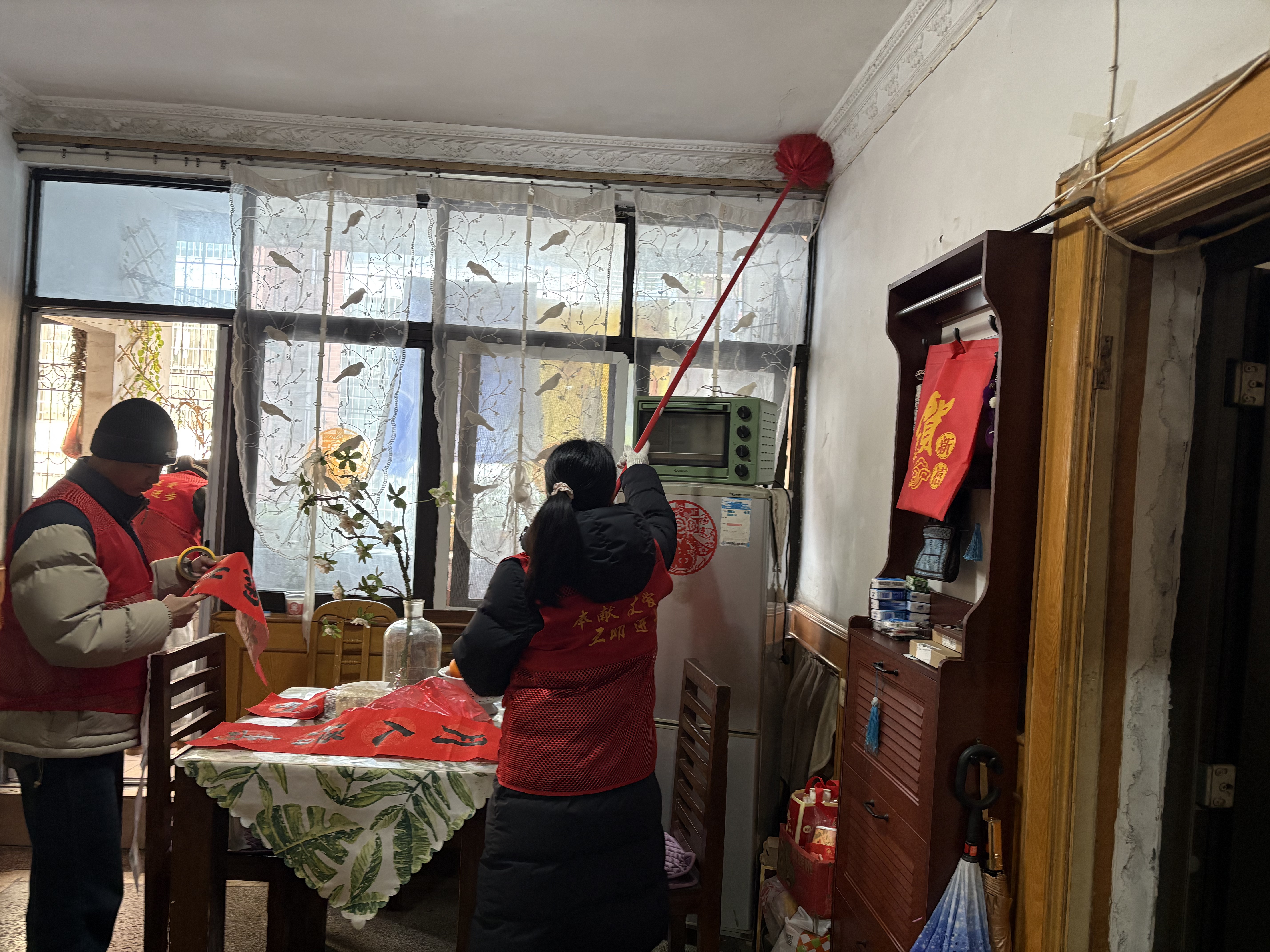 擦玻璃、扫灰尘、整理衣物、贴春联……志愿者们分工协作,动作麻利又细心。鲜红的春联贴上门框,吉祥的福字倒贴在窗上,原本冷清的小屋瞬间被浓浓的年味包裹。看着焕然一新的家,程阿姨拉着志愿者坐下来,不停念叨着心里的感动。“我年纪大了,腿脚不利索,弯腰干活都费劲,过年打扫、贴对子这些事,想做都做不了。多亏了你们,不光帮我把家里收拾得干干净净,还陪我说话,跟亲闺女一样贴心。”