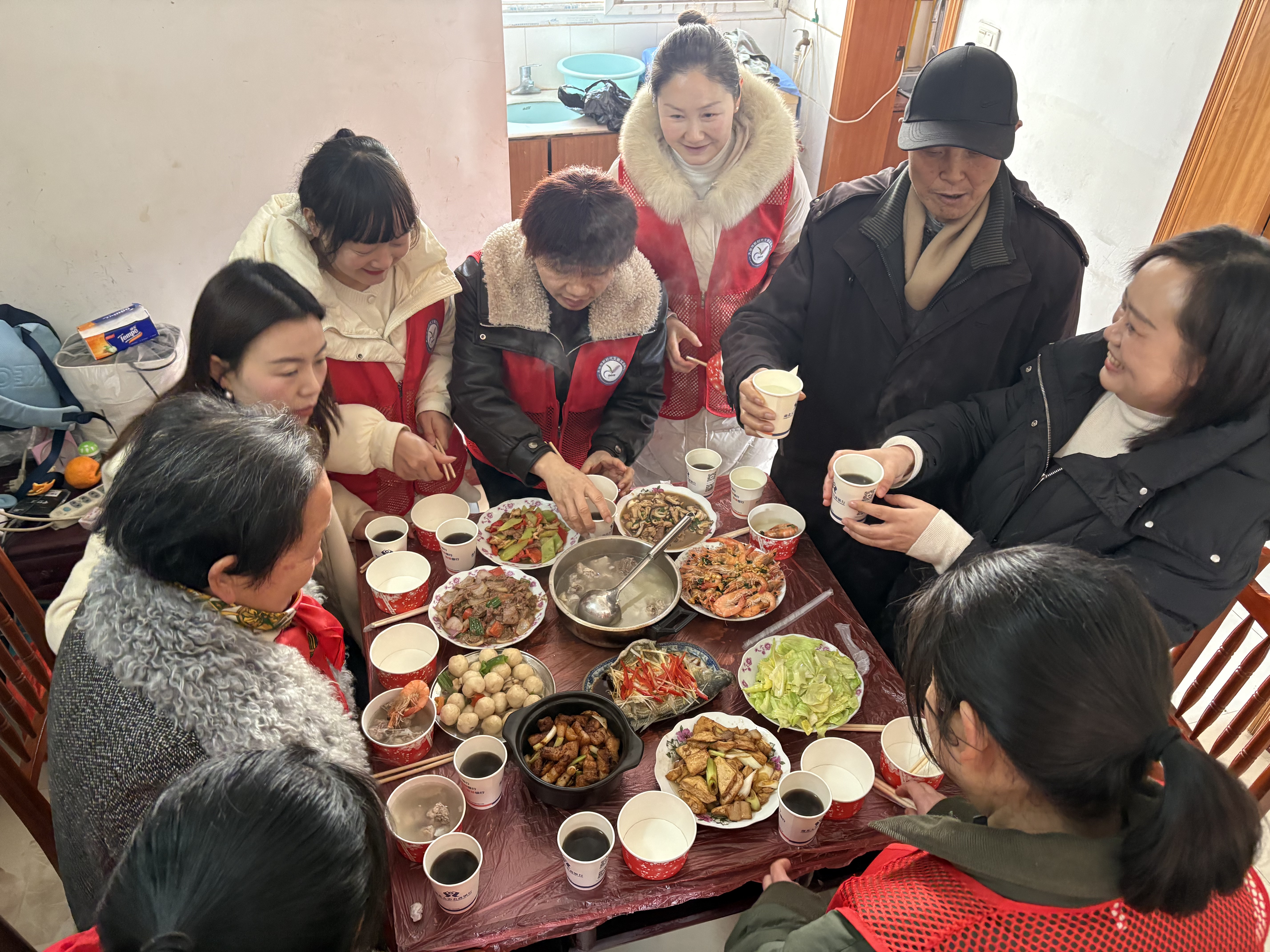 “来,两位老宝贝,我们一起举杯!祝你们身体健康、笑口常开,新的一年平平安安,以后有任何困难,随时找我们社区!”志愿者们围坐在老人身边,举杯共祝小年快乐,温馨的话语、欢快的笑声,填满了整个房间。
