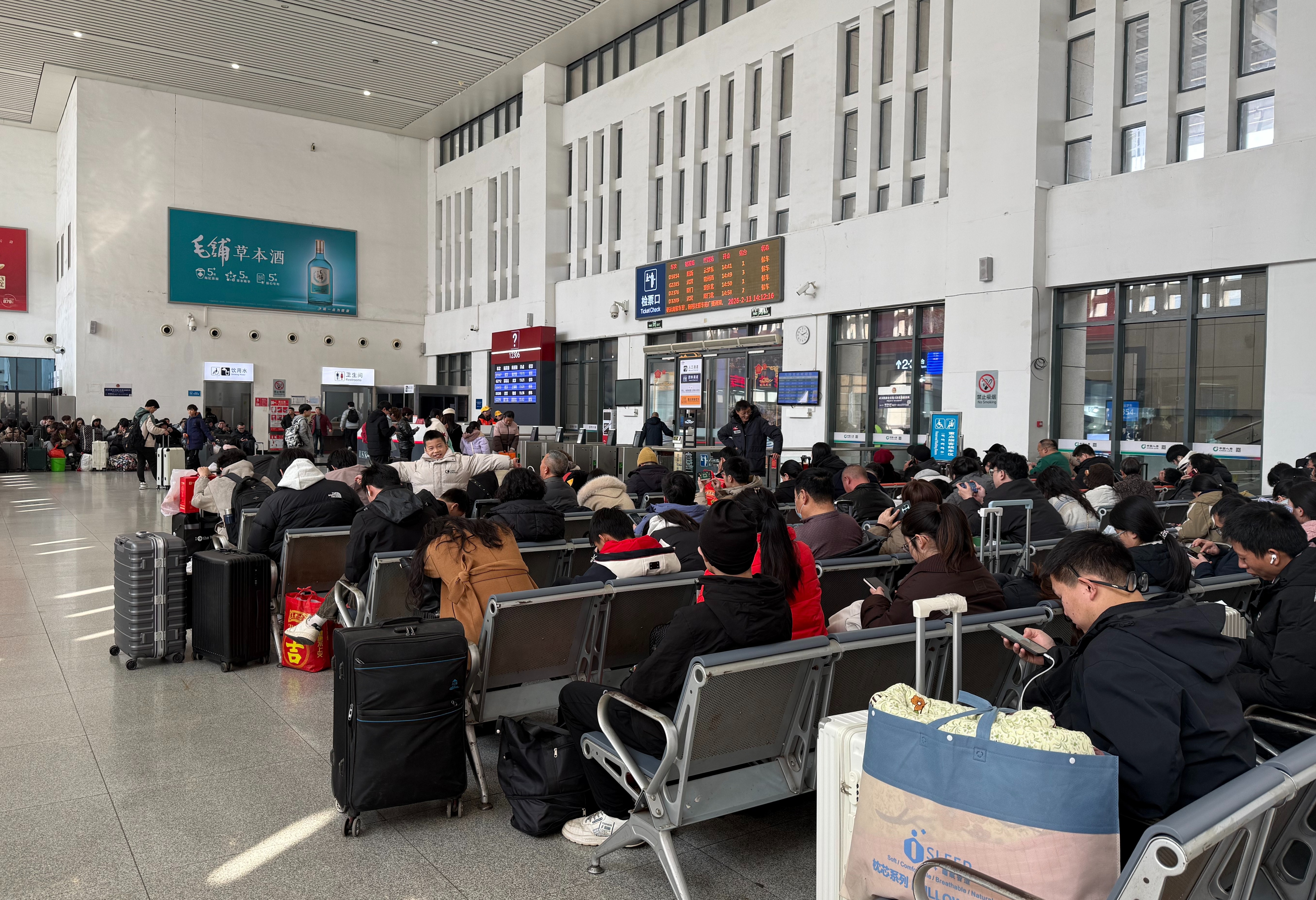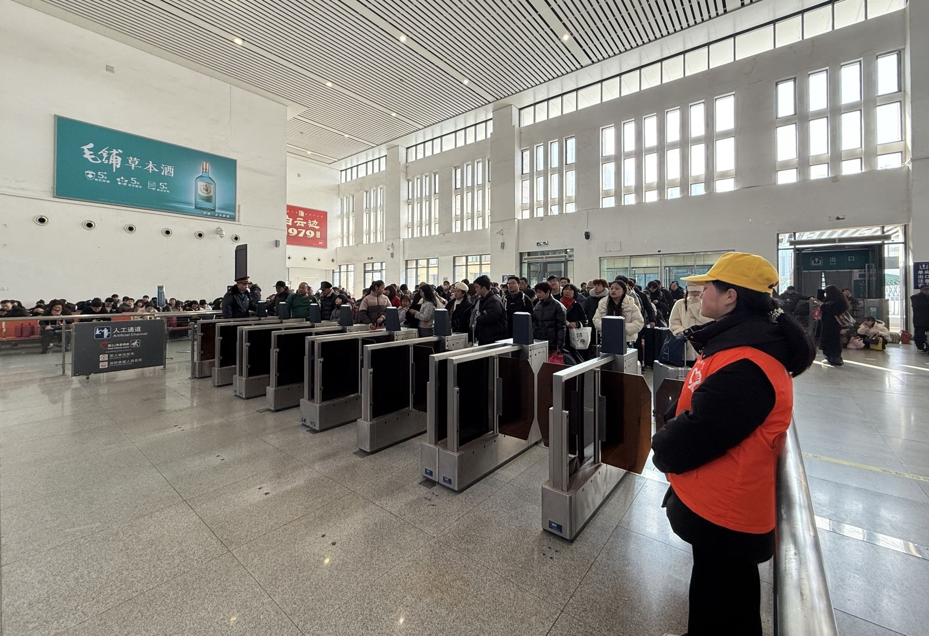 大冶北站客运员李诗敏在出站口引导人流,她告诉记者,节前车站以到达客流为主,2月13、14日将迎来返程最高峰,日均到达旅客预计将突破8000人。“我们已经加开出站检票通道,加强秩序引导,保证大家出站顺畅。”