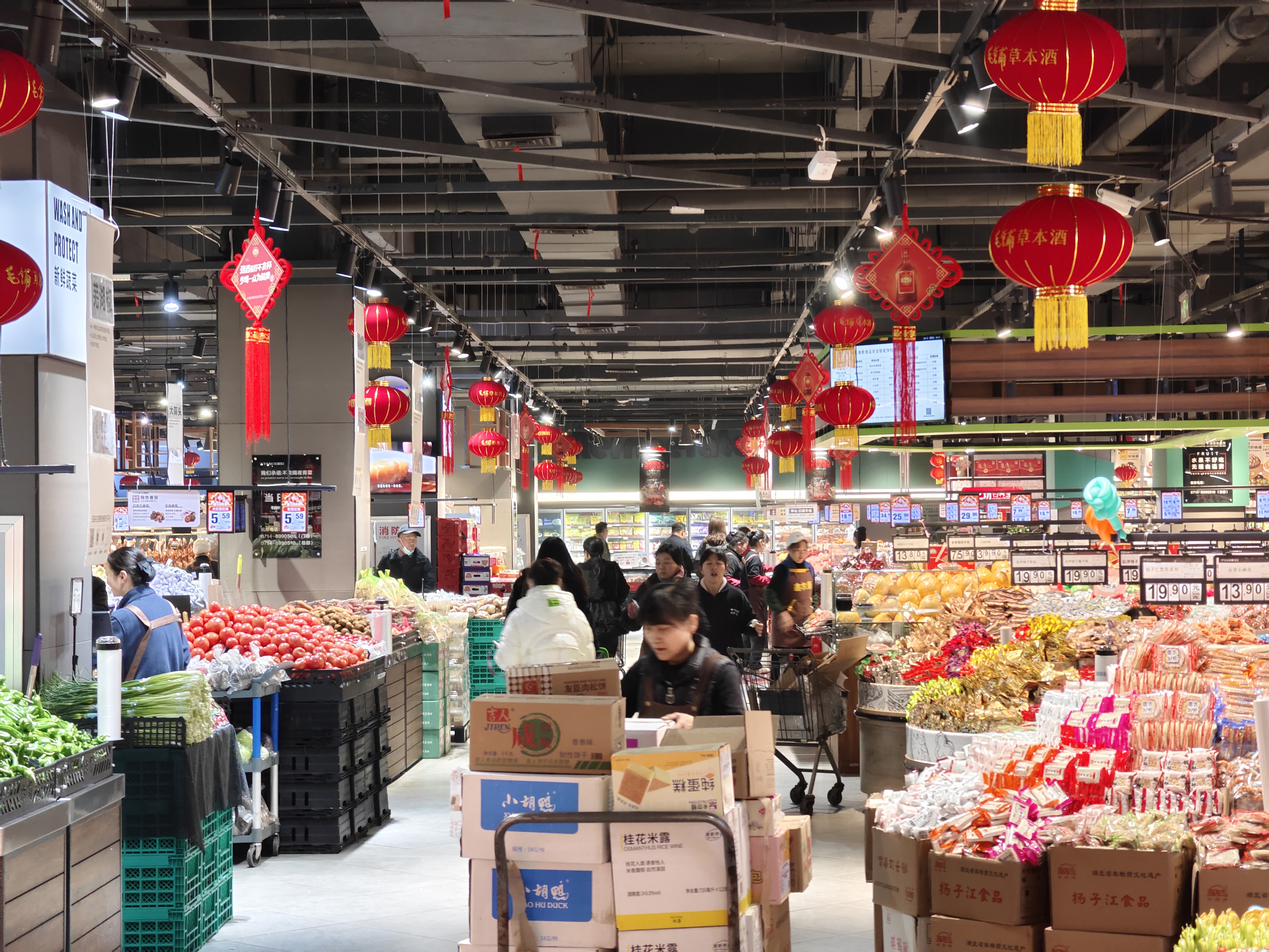 农贸市场人气旺盛,城区商超同样年味浓郁、备货充足。位于雨润中央商场的雅斯·冶商店内,新春装饰点缀各处,年货专区、民生商品区人头攒动,米面油、坚果礼盒、酒水饮料等商品一应俱全,一站式满足家庭采购需求。