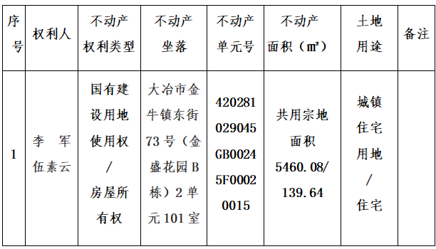 李军、伍素云对坐落于大冶市金牛镇东街73号(金盛花园B栋)2单元101室不动产申请登记,经审核,李军、伍素云已取得《房屋所有权证》(证号:大冶市房权证07字第3199号,大冶市房权证07字第3200号),土地证未办。因转让方黄石市祥和房地产开发有限公司无法在不动产登记申请书中申请人(义务人)栏签章,现根据《不动产登记暂行条例》、《不动产登记暂行条例实施细则》、《不动产登记操作规范(试行)》之规定,我中心对该申请予以审查并予公告。如对所述内容有异议,请自本公告之日起十五个工作日内将异议书面材料送达大冶市不动产登记中心综合窗口。逾期无人提出异议或者异议不成立的,我机构将予以登记并颁发不动产权证书。