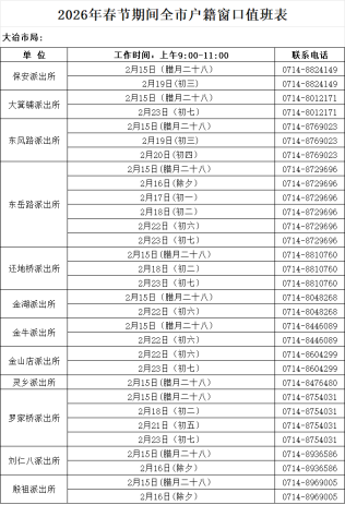 云上大冶报道(记者 刘娟)2月13日,记者从市公安局获悉,春节期间,全市各派出所将推出户政窗口错时服务、预约办理“不打烊”等暖心举措,全力保障群众办事便捷顺畅。