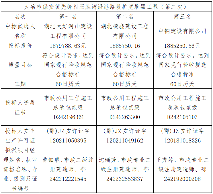 大冶市保安镇先锋村王胜湾沿港路段扩宽刷黑工程(第二次)于2026年02月25日在大冶市农村综合产权交易中心二楼开标室开标,并于2026年02月25日完成评标工作。根据评标委员会提交的评标报告,大冶市保安镇先锋村王胜湾沿港路段扩宽刷黑工程(第二次)已经确认评标结果,现进行评标结果公示。