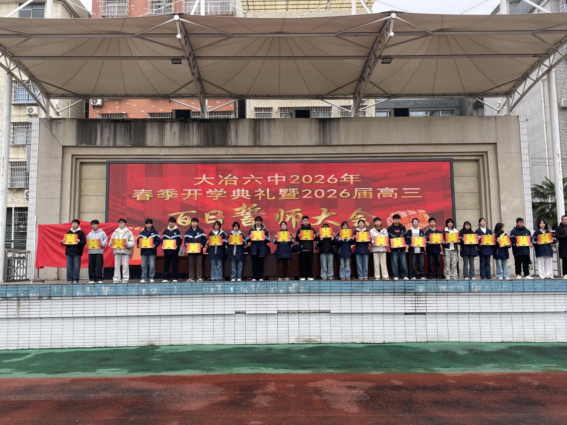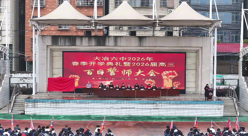 云上大冶报道(记者 熊业欣)2月28日,大冶六中举行2026年春季开学典礼暨高三高考百日誓师大会,全校师生以昂扬姿态开启新学期,为高三学子冲刺高考擂响战鼓。