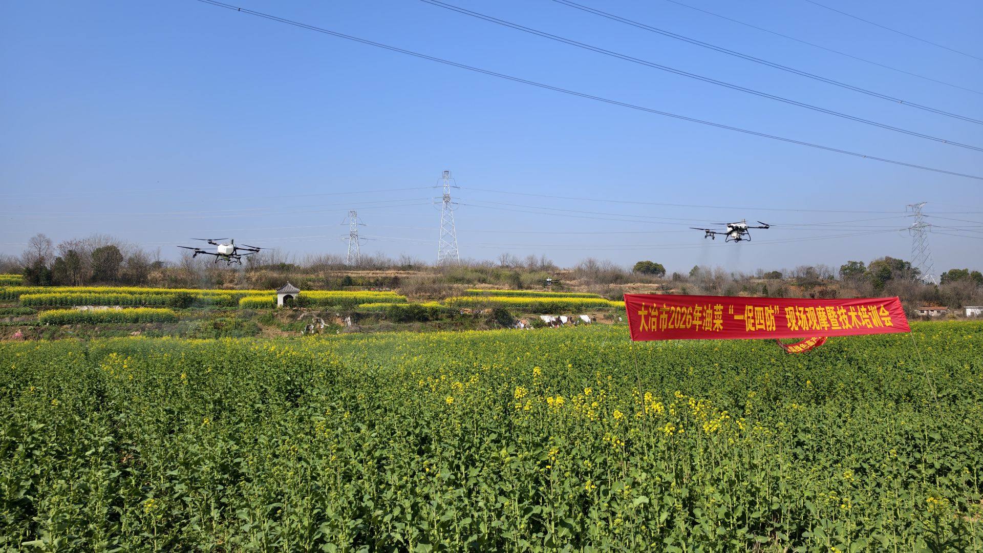 除了天上飞的“科技好帮手”,地上还有一群“田保姆”贴心护航。“‘一促四防’就是通过一次性叶面喷施药肥混配液,达到防花而不实、防早衰、防高温逼熟等效果……”农技人员结合油菜生长实际,为农户们现场教学、答疑解惑。