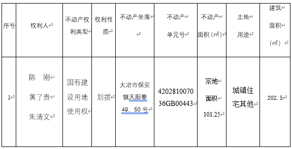 陈刚、黄了贵、朱清文 位于大冶市保安镇天阳巷49、50号土地,因办理不动产登记需要进行不动产地籍调查,根据《国土资源部关于做好不动产权籍调查工作的通知》(国土资发【2015】41号)、《地籍调查规程》(GB/T 42547-2023)、《自然资源部关于加快解决不动产登记若干历史遗留问题的通知》(自然资发[2021]1号文)、鄂自然资函【2020】390号文,及相关法律法规,现将该宗地不动产权籍调查结果予以公示,若相关邻宗地土地权属人对该宗地的公示情况有异议的,请自本公告之日起十五个工作日内将异议书面材料送达我中心。逾期无人提出异议或异议不成立的,我中心将按不动产权籍公告结果予以登记。