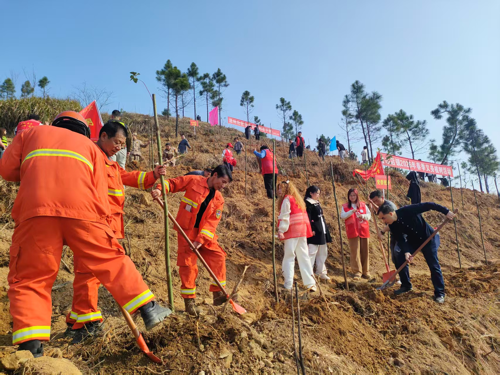 活动现场,大家分工协作、干劲十足。挥锹铲土、扶苗填坑、踩实浇水,每一道工序都认真细致、有条不紊。山野间一派繁忙景象,新栽苗木迎风挺立,为春日的笔架山增添勃勃生机。