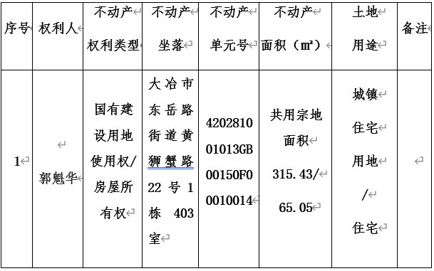 郭魁华对坐落于大冶市东岳路街道黄狮蟹路22号1栋403室不动产申请登记,经审核,郭魁华已取得《房屋所有权证》(证号:01-10642),土地证未办。因转让方汪丽君、湖北拖车厂不能到不动产登记机构申请签章,现依照《不动产暂行条例》、《不动产暂行条例实施细则》之规定,我中心对该申请予以审查并予公告。如有异议者,请自本公告刊登之日起十五个工作日内将异议书面材料送达大冶市不动产登记中心综合窗口。公告期满无异议或者异议不成立的,我机构将予以登记并颁发不动产权证书。