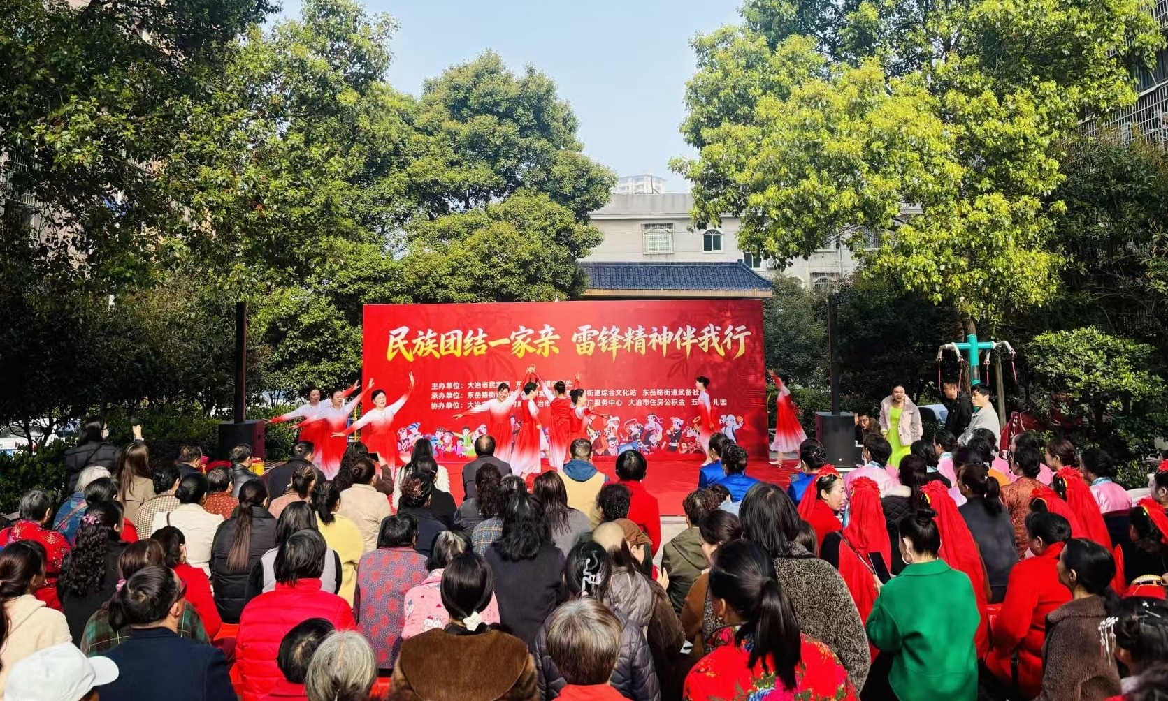 云上大冶报道(记者 刘娟)3月25日上午,东岳路街道武备社区天子湖小区内歌声悠扬、暖意融融,“民族团结一家亲雷锋精神伴我行”主题文化交流活动在这里举行,300余名居民欢聚一堂,共赏民族文化、共践雷锋精神。