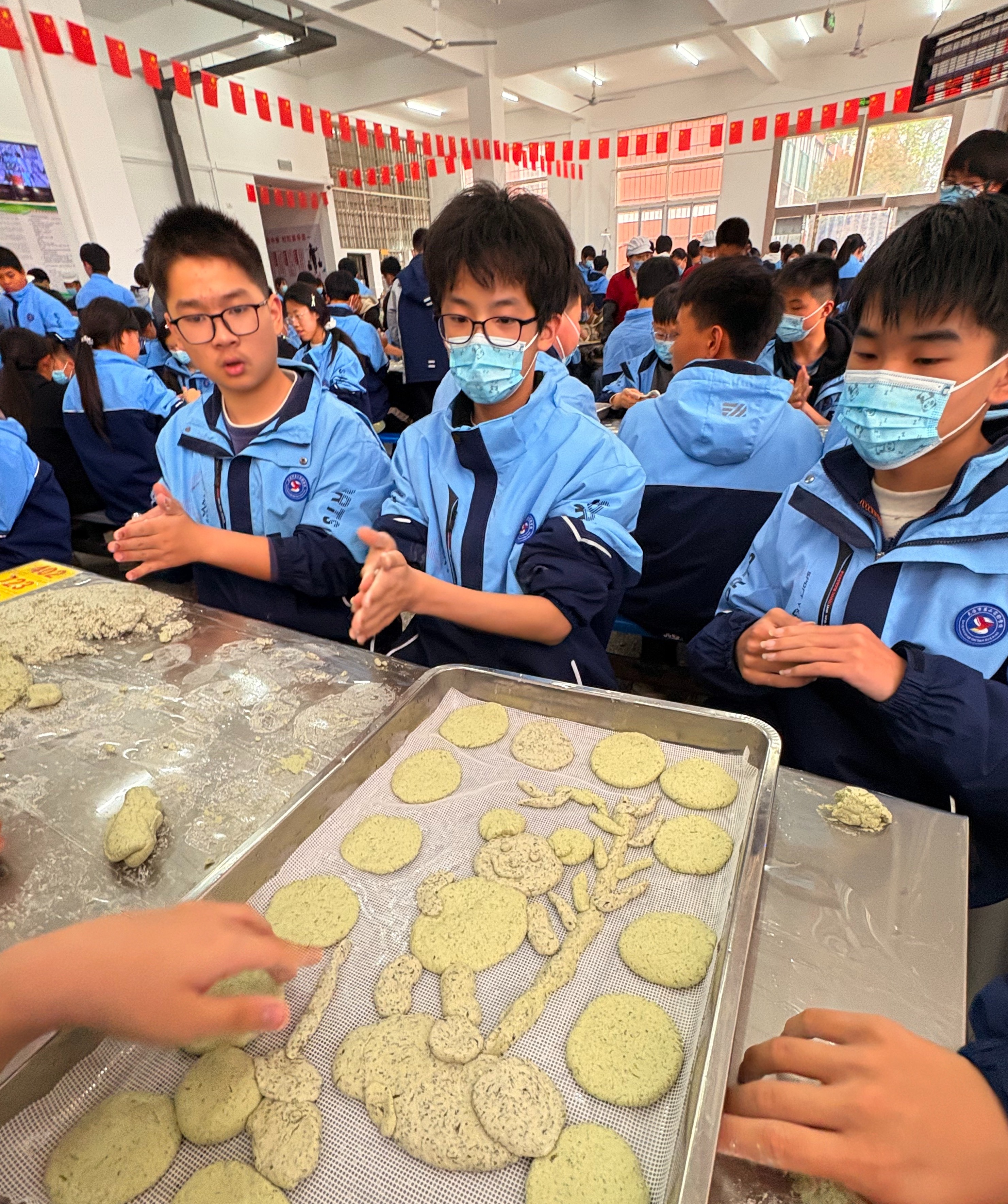 当天,该校组织七年级全体师生开展“寻味家乡美食,传承传统文化”主题实践活动,以班级为单位分组协作,按照步骤,将米粉、新鲜蒿子等食材充分揉和,亲手制作家乡传统美食——蒿子粑。揉面、塑形、摆放,每一个环节都充满乐趣,同学们相互配合、互帮互助,在动手实践中感受传统美食制作的匠心与乐趣。