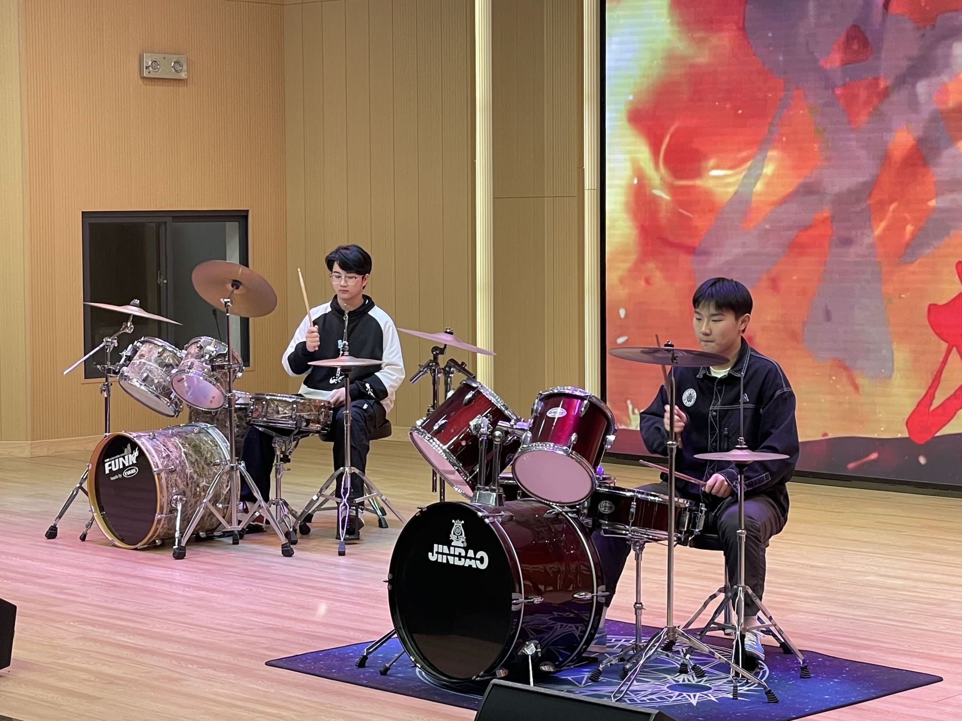 课堂之外,艺术氛围浓厚。家长们来到三楼艺术展厅,书法、绘画作品有序陈列,展现出学生丰富的精神世界。二楼报告厅内,美育成果展演将活动推向高潮:歌曲演唱清越动人,古典舞蹈优雅婉转,架子鼓表演激情澎湃……多样的节目,展现出学生们朝气蓬勃的青春风采。台下家长纷纷举起手机,记录下孩子们自信绽放的瞬间。