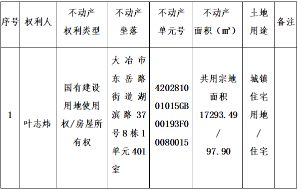 叶志炜对坐落于大冶市东岳路街道湖滨路37号8栋1单元401室不动产申请登记,经审核,叶志炜已取得《房屋所有权证》(证号:大冶市房权证01字第19919号),土地证未办。因转让方梁前威不能到不动产登记机构申请签章,现依照《不动产暂行条例》、《不动产暂行条例实施细则》之规定,我中心对该申请予以审查并予公告。如有异议者,请自本公告刊登之日起十五个工作日内将异议书面材料送达大冶市不动产登记中心综合窗口。公告期满无异议或者异议不成立的,我机构将予以登记并颁发不动产权证书。