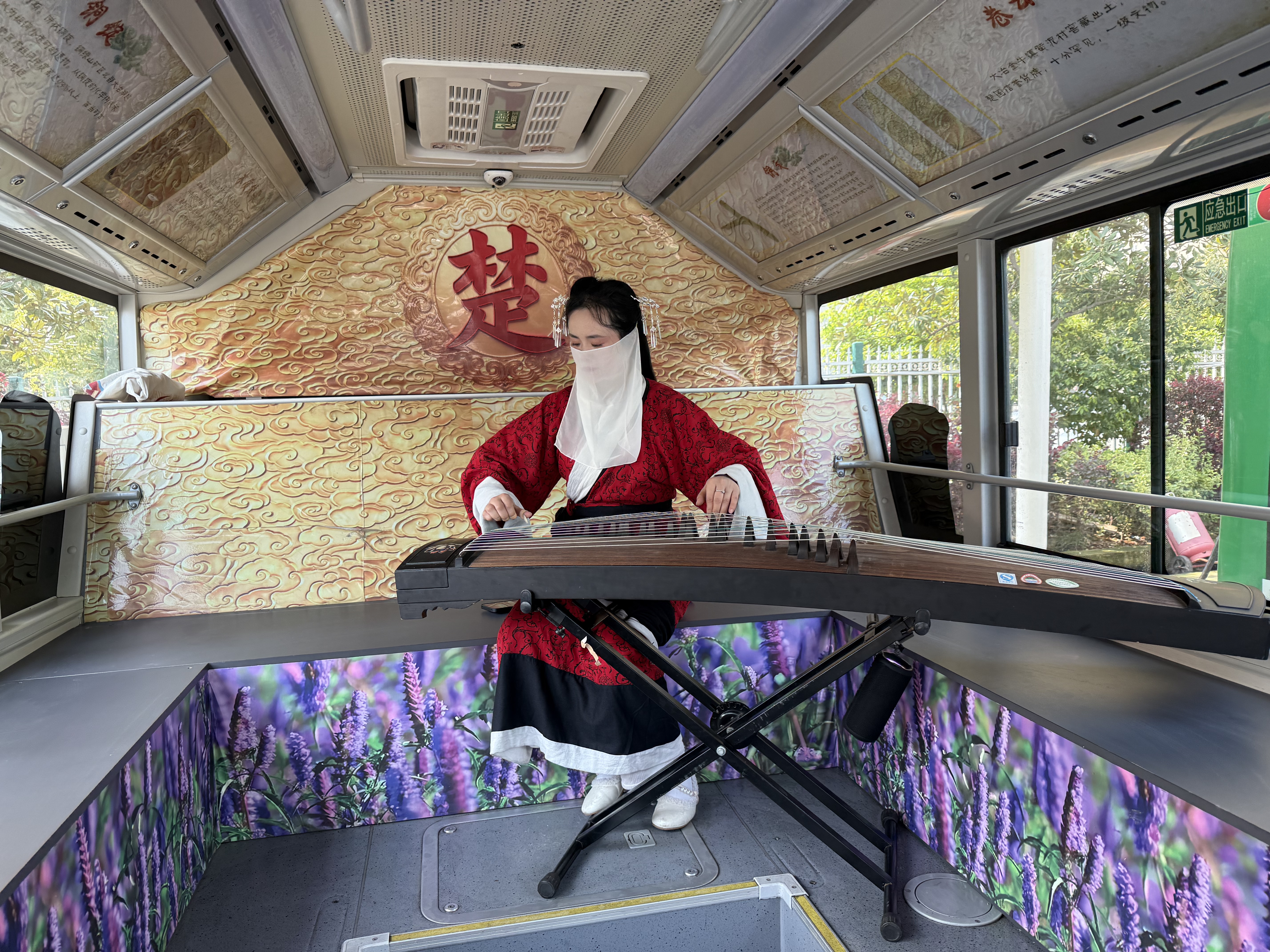 主题公交青铜巴士的车身上,“华夏青铜文明圣地 世界矿冶文化名城”十六个大字赫然在目,整台车以“青铜绿”“矿冶橙”为主色调,绘制有青铜器皿、矿冶纹样等元素,车厢内则张贴着文物与历史科普内容,犹如一处微缩的“青铜文化展厅”。运行途中,身着古装的“楚女”现场弹奏古筝,悠扬古韵萦绕车厢,让人仿佛穿越回千年前的矿冶时代。“这种形式很新颖,能真切了解家乡青铜文化,特别自豪。”市民徐婷婷说。