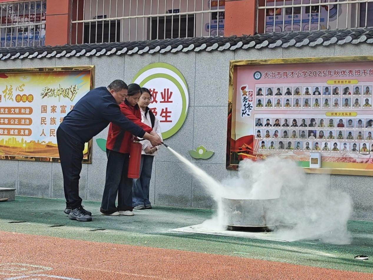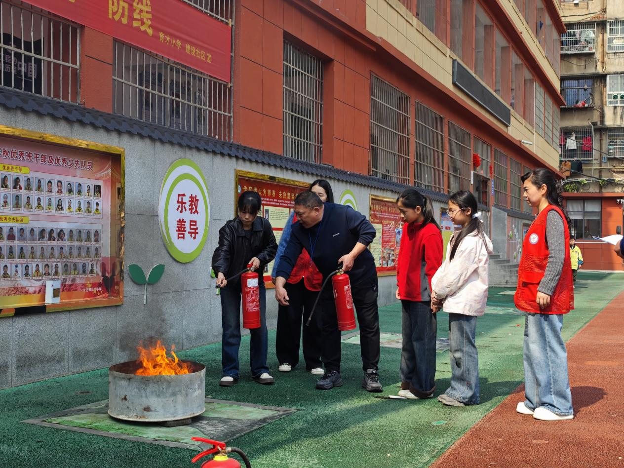 集结完毕后,消防员现场演示灭火器使用方法,细致讲解“提、拔、握、压”操作要领,组织师生逐一上手实操,并全程指导纠错,帮助大家熟练掌握初期火灾处置技能。