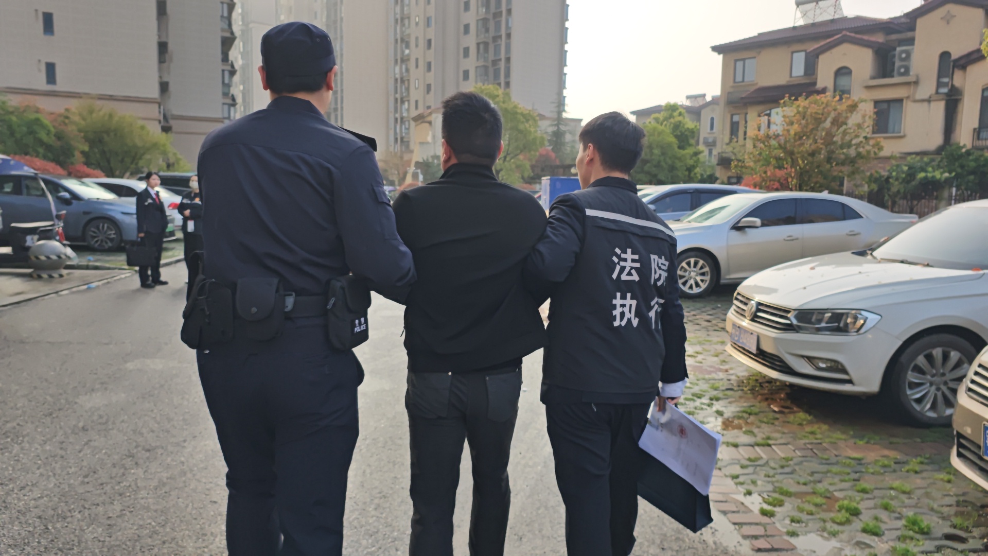 行动当日,执行干警刚抵达柯某所住小区,便迅速展开布控。三路警力分工明确、配合默契。一队找到柯某日常驾驶的车辆,牢牢看守;一队把守住单元出入口,防止其逃脱;另一队则上楼敲门,正面寻找柯某。