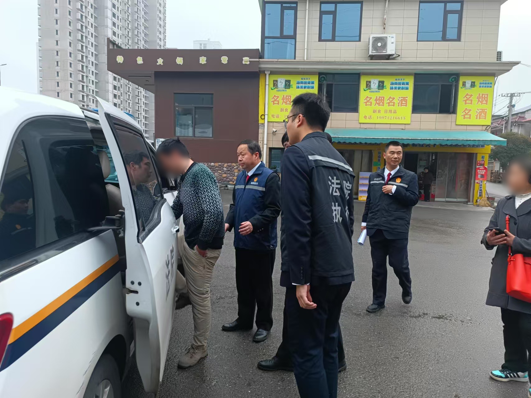 车辆行驶一段时间后,在某超市门口对面停下,两人下车争执不下,执行干警及时赶到,迅速将饶某控制并依法拘传。