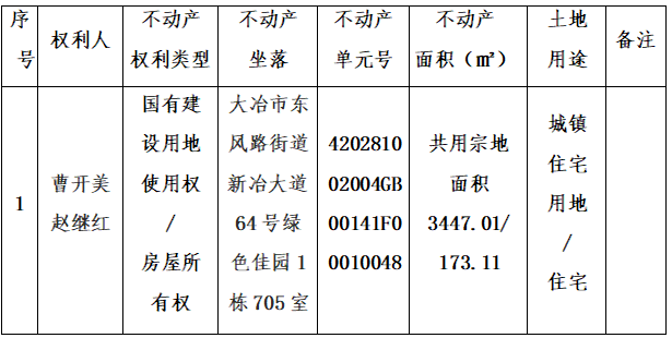 曹开美、赵继红对坐落于大冶市东风路街道新冶大道64号绿色佳园1栋705室不动产申请登记,经审核,曹开美、赵继红已取得《房屋所有权证》(证号:大冶市房权证02字第31232号,大冶市房权证02字第31233号),土地证未办。因转让方大冶市圣山房地产开发有限公司无法在不动产登记申请书中申请人(义务人)栏签章,现根据《不动产登记暂行条例》、《不动产登记暂行条例实施细则》、《不动产登记操作规范(试行)》之规定,我中心对该申请予以审查并予公告。如对所述内容有异议,请自本公告之日起十五个工作日内将异议书面材料送达大冶市不动产登记中心综合窗口。逾期无人提出异议或者异议不成立的,我机构将予以登记并颁发不动产权证书。