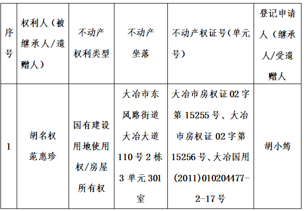 大冶市不动产登记中心不动产权继承公告(2026)第180号